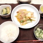 今晩はカラスカレイの煮つけ。少しさめているが、その方が味が染みてよい(大乃コメント)山芋ときゅうり細切りのおかか和え。たっぷりもやしと、豚肉・人参・ピーマン・ワカメ・卵炒め。ワカメを少し入れたら、色だ …