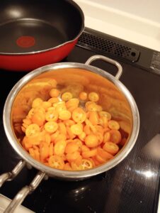 しかしいただいたキンカンがとても小さいので、3つの輪切りにし種を取り、軽く炊いてはちみつ漬けにしました。