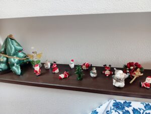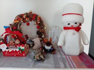 サンタ人形やリースを同じ所に並べるだけなんですが、それだけで12月という季節の区切りを感じます。