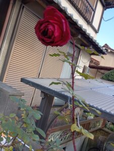 我家の鉢植えに、小さな深紅のバラが咲きました。 鉢植えの為か面倒見が悪いからか、枝が細くてバラのつぼみの重さに耐えられなく、花が折れかかっていたので一輪挿しに入れました。 色もつぼみの形もとても美しい …