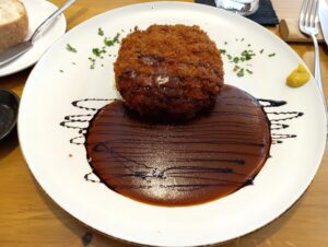 メンチカツはお肉がぎっしり詰まって食べ応えがあります。デミグラスバルサミコ味のメンチカツは、玉葱たっぷりのバルサミコソースが掛かっていてうれしい。