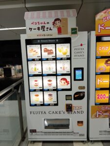 阪急茨木駅で見つけた「ドーナツガチャ」の隣に「ペコちゃんのケーキ屋さん」自動販売機があります。