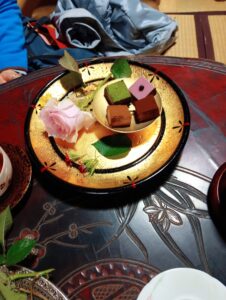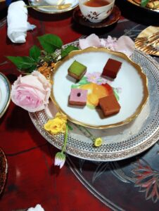 アンティークや塗りの器に並べられた生チョコは、花で飾られたお皿に盛られ輝いていました。