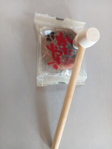 付いている木づちでは割れないので、かた焼きどおしたたき合って割ります。