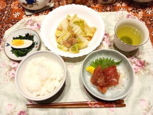 風邪ひいたので、今日はワインでなく日本茶でいただきました。