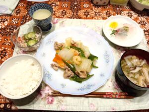 白菜・人参・ピーマン・海老・豚肉たっぷりの八宝菜です。