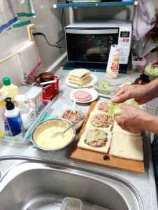レタス、ハム、チーズ、きゅうり、玉葱、シーチキンのサンドを作る。