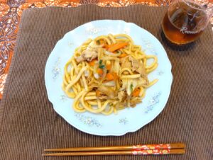 うどん玉があると、私はお揚げさんとネギ入れてあったかうどんしか思いつきませんが、たまに焼うどんにするとなんだか新鮮。