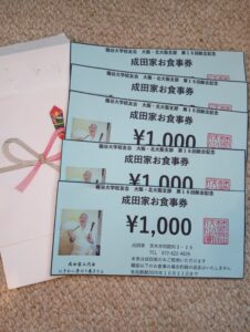 大乃が同窓会で一等賞をあてて、成田屋さんの金券をゲット。