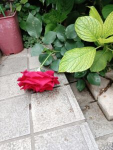 地面にぐったりしている、かわいそうなお花ちゃんを見つました。