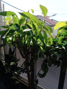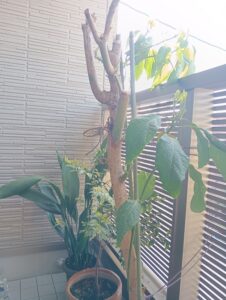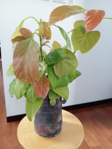 冬にほとんど落ちた葉は夏の暑さの時はどんどん成長して、新芽がとてもいい色になりました。伸びすぎたので、花器で楽しんでいます。