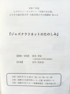 大阪音楽大学公開講座の最終回は「ジャズクラリネットのたのしみ」